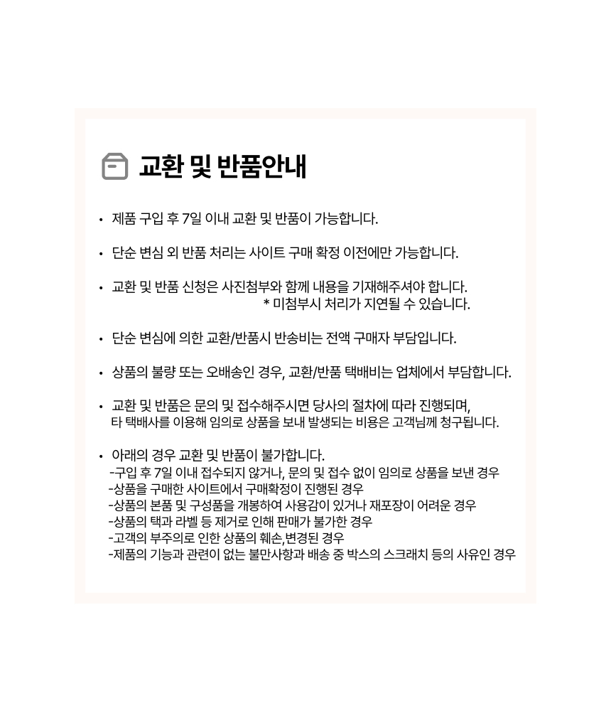 • 단순변심으로 인한 반품 시, 배송 완료 후 7일이 지나면 취소/반품 신청이 접수되지 않습니다.