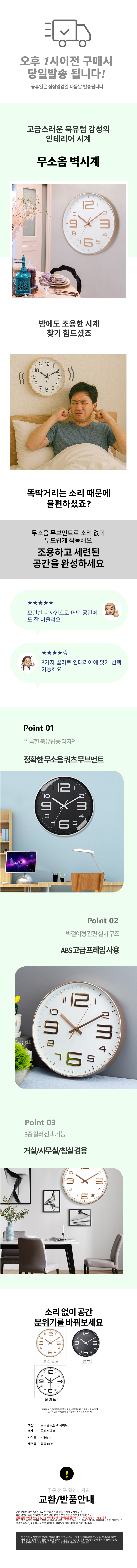 무소음 벽시계 모던 벽걸이시계 3종 색상 거실