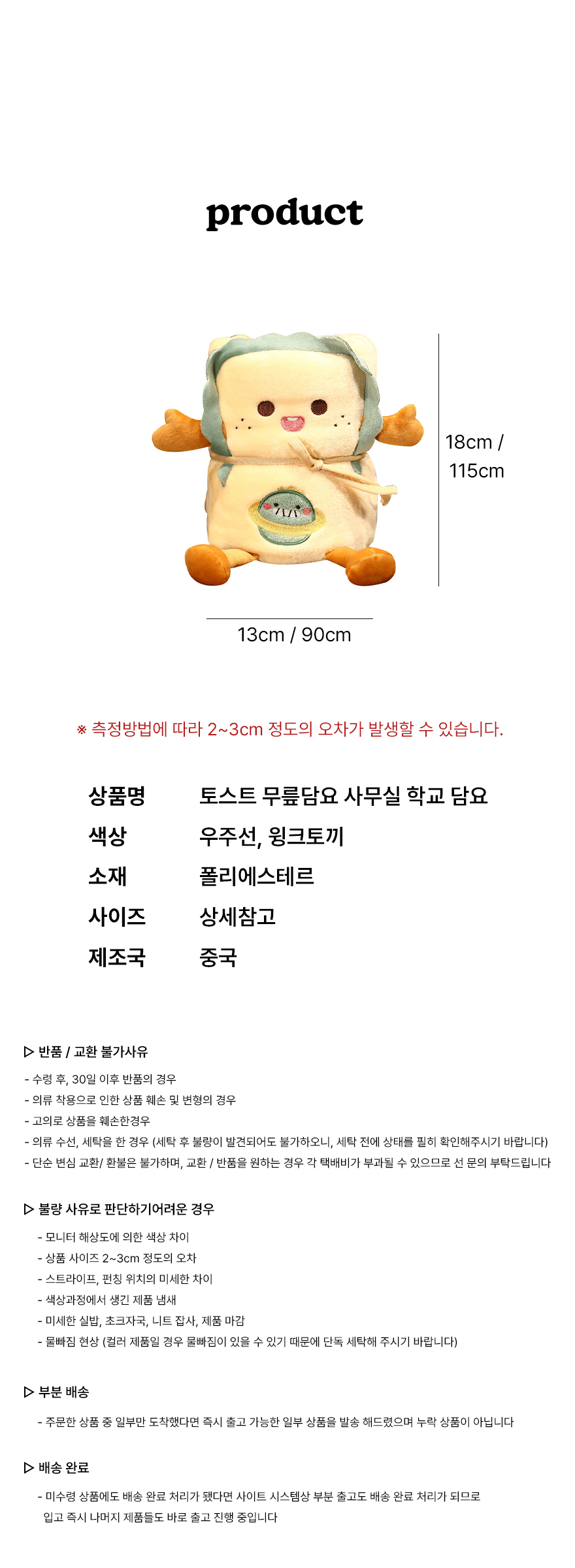• 단순변심으로 인한 반품 시, 배송 완료 후 7일이 지나면 취소/반품 신청이 접수되지 않습니다.