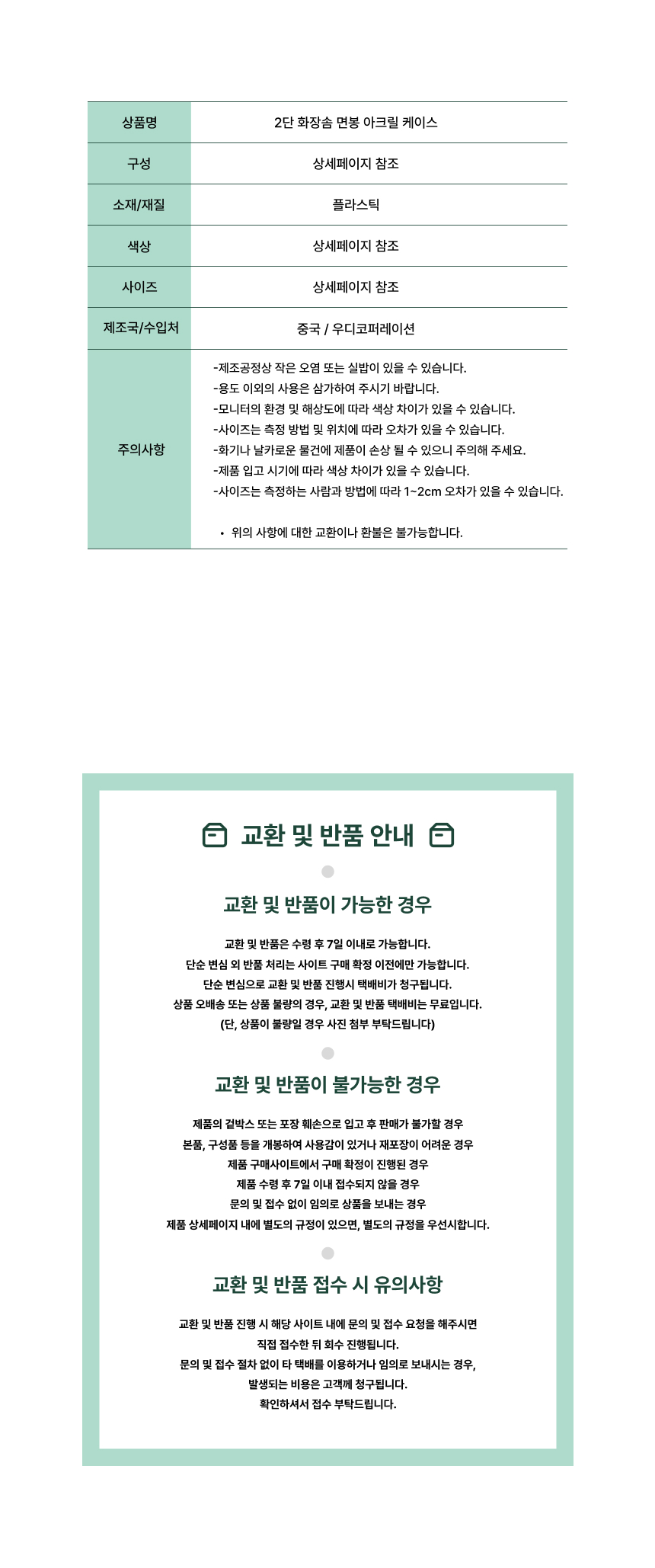 제품하자가 아닌 소비자의 단순변심, 착오구매에 따른 청약철회가 불가능한 경우 그 구체적 사유와 근거 배송ㆍ교환ㆍ반품 상세설명페이지 참고