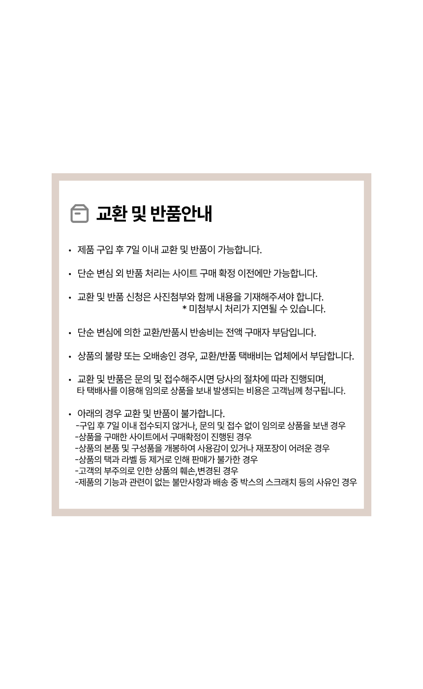 • 단순변심으로 인한 반품 시, 배송 완료 후 7일이 지나면 취소/반품 신청이 접수되지 않습니다.