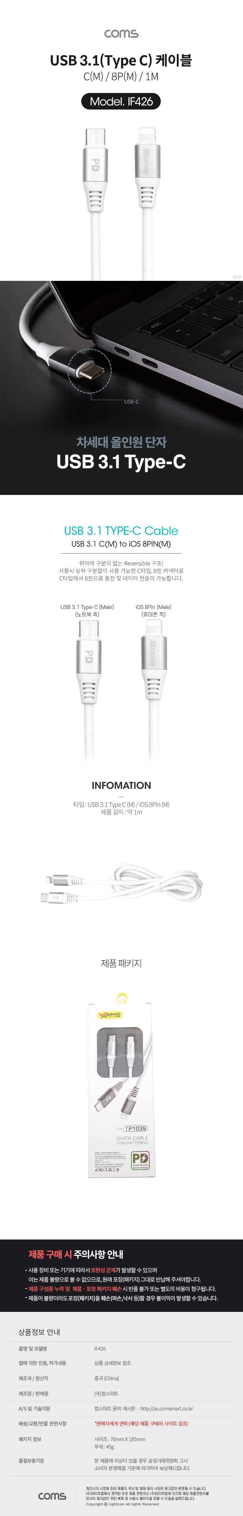 USB 3.1(Type C) to 8핀 케이블 (M/M)/1M/IF426