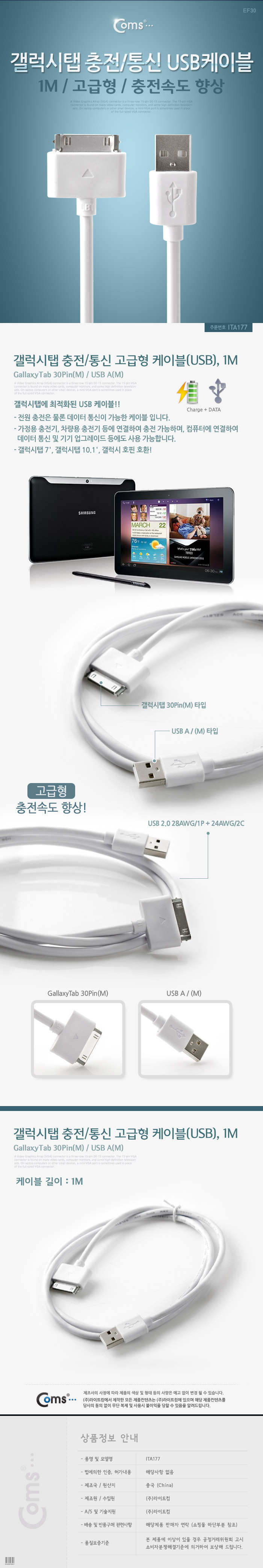 갤럭시탭 충전/통신 케이블(USB) 1M 충전향상 30핀(30Pin) ITA177