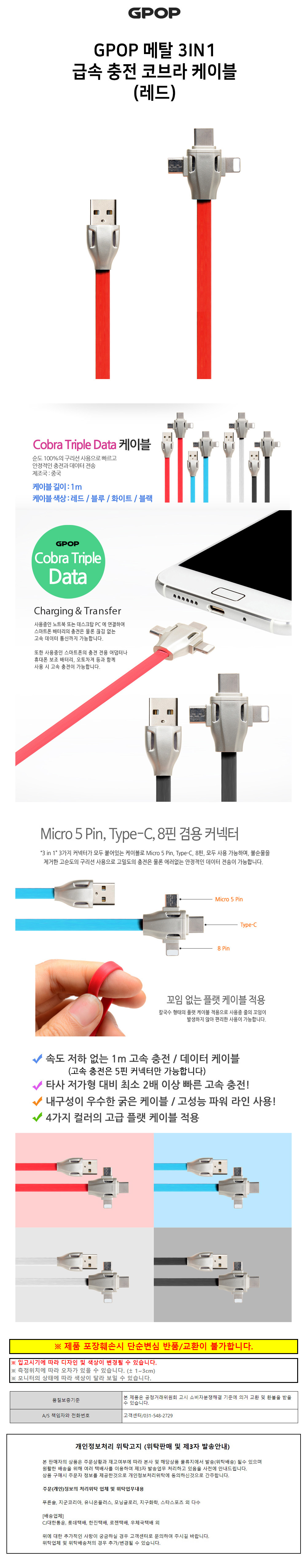 GPOP 메탈 3IN1 급속 충전 코브라 케이블 (레드)