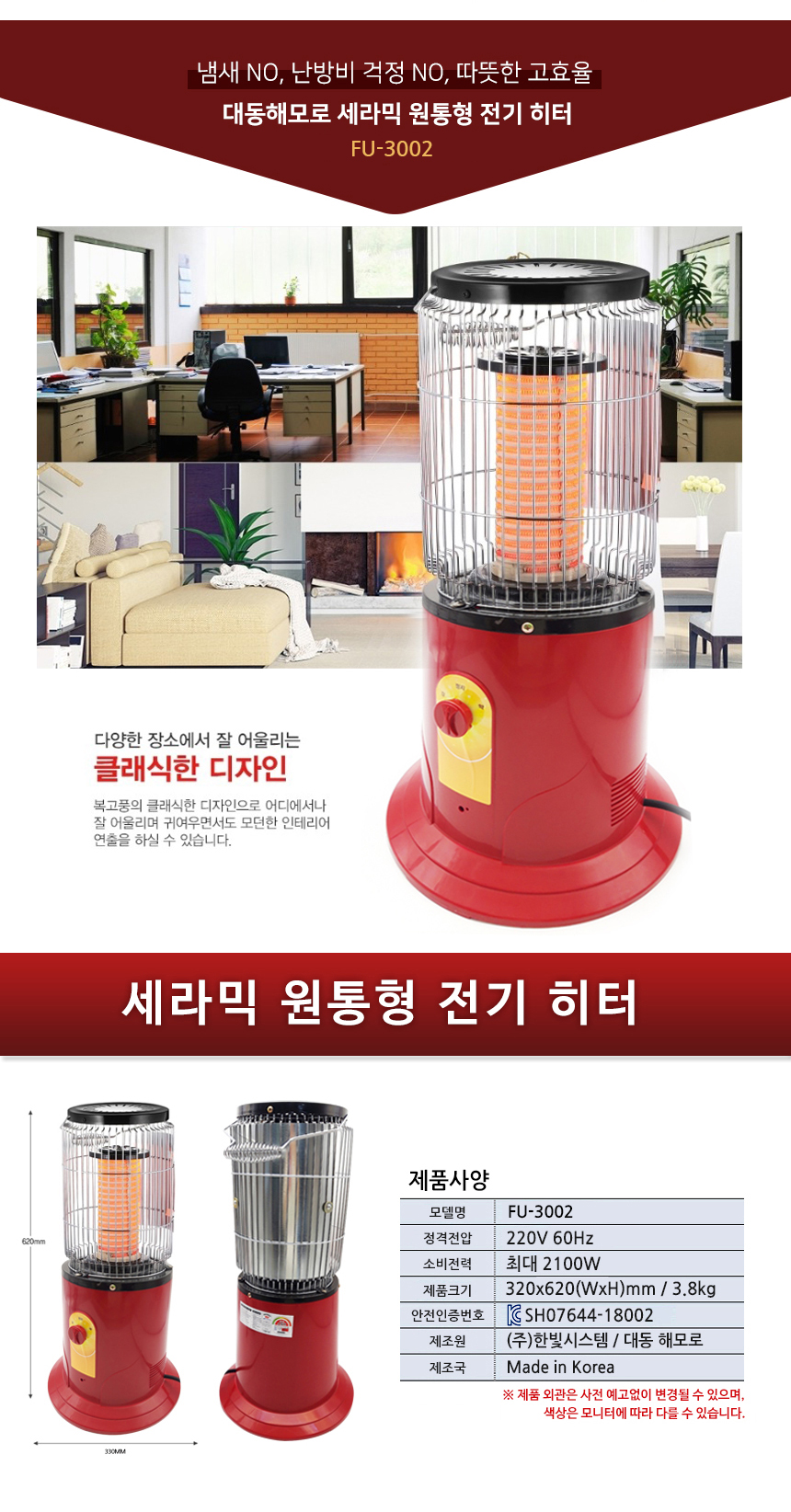| 품명 및 모델명 | 품명:세라믹 원통형 전기 히터 / 모델명:FU-3002 |