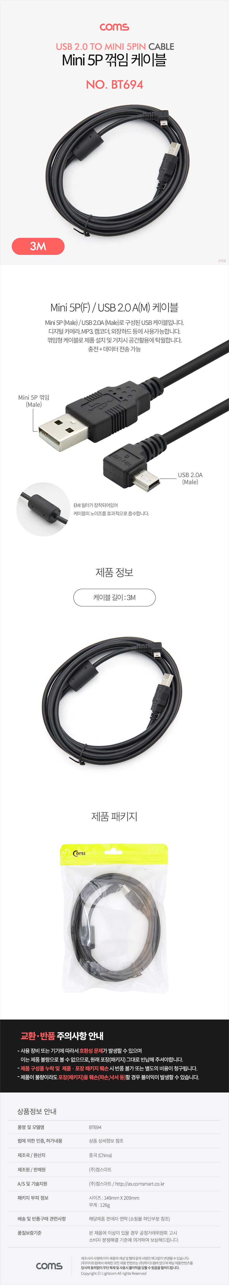 Mini 5P 꺾임 케이블 3M / Mini 5P(M) / USB 2.0 A(M)