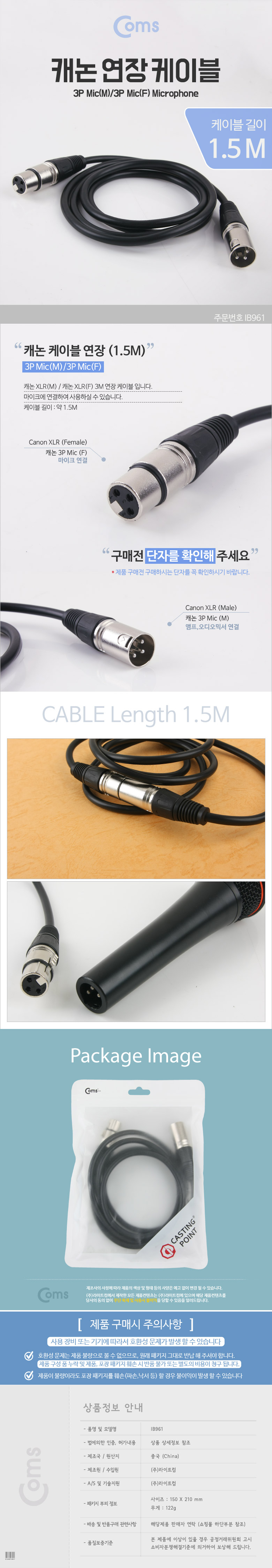 캐논 케이블 연장 1.5M/XLR(Canon, 3P mic)