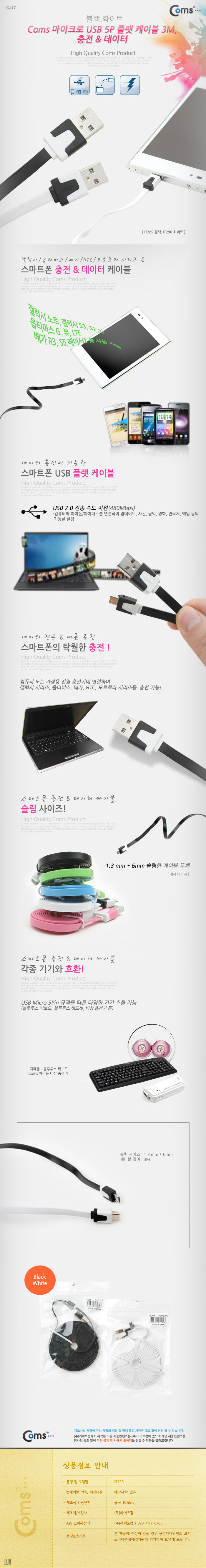 USB/Micro B 플랫 케이블 3M, 충전 & 데이터(화이트) IT290