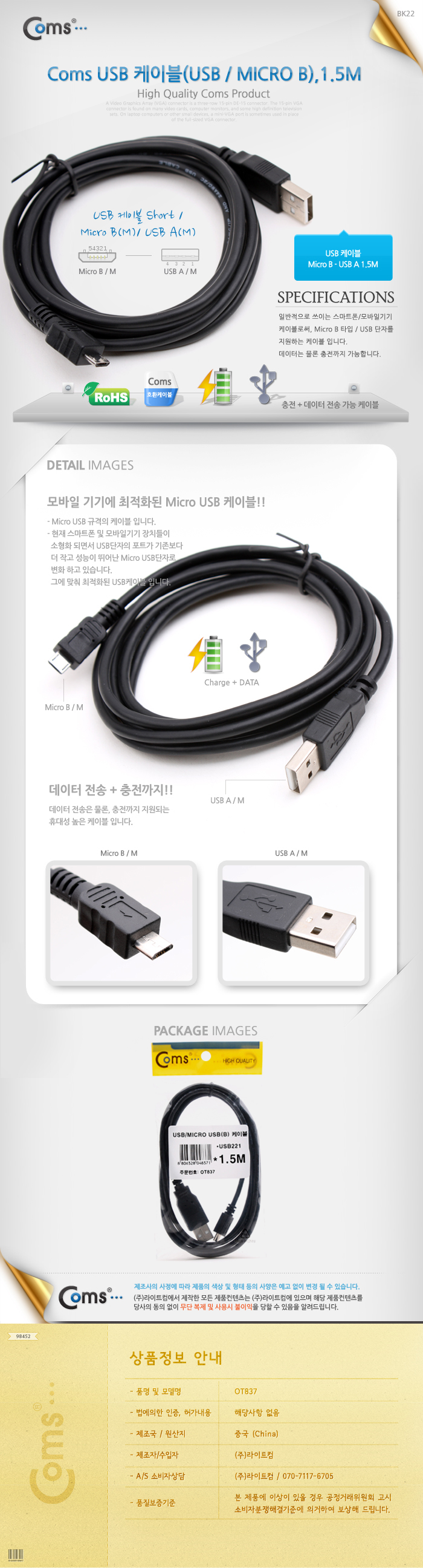 USB/MICRO USB(B) 케이블, 1.5M OT837
