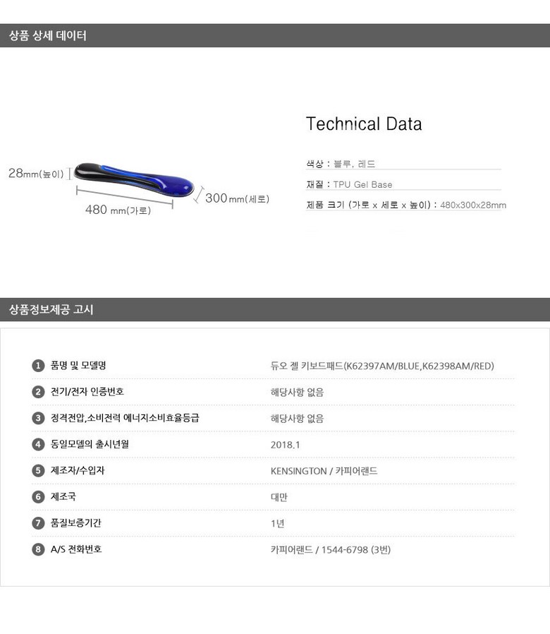 | 품명 및 모델명 | 켄싱턴 듀오 젤 키보드패드 레드 K62398AM |