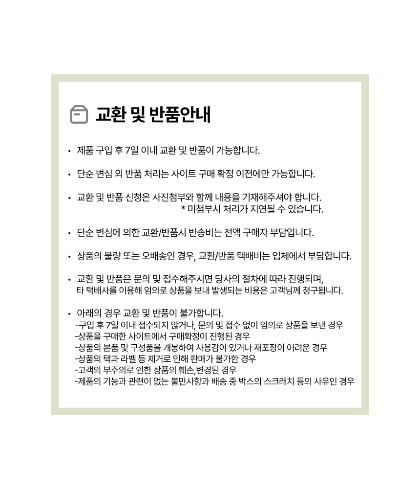 • 단순변심으로 인한 반품 시, 배송 완료 후 7일이 지나면 취소/반품 신청이 접수되지 않습니다.