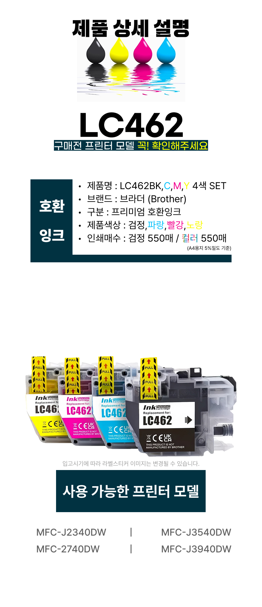 브라더 잉크 프린트 프린터잉크리필 호환 LC462 검정 칼라 소용량 4색 SET