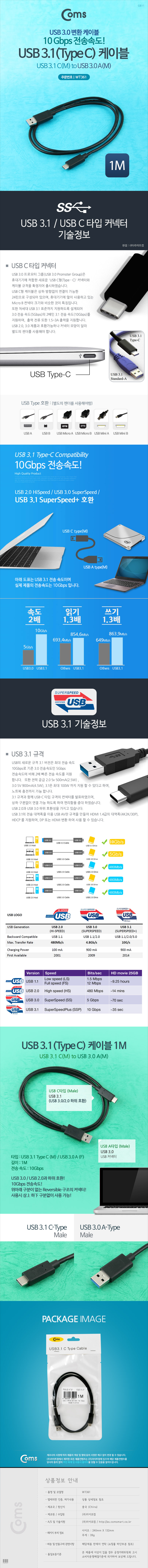 USB 3.1 케이블 C(M) - A(M) 1M, 10Gbps WT361