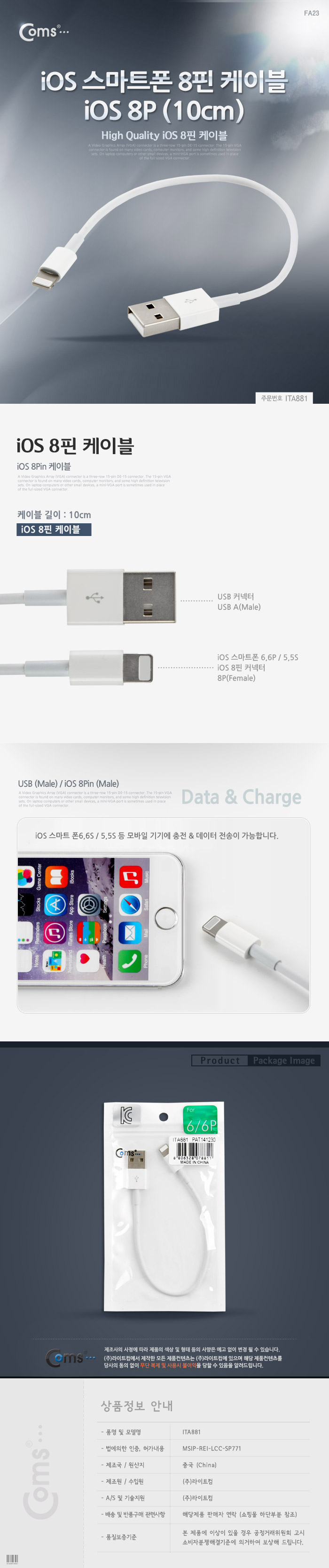 iOS 스마트폰 8핀 케이블10cm, White ITA881