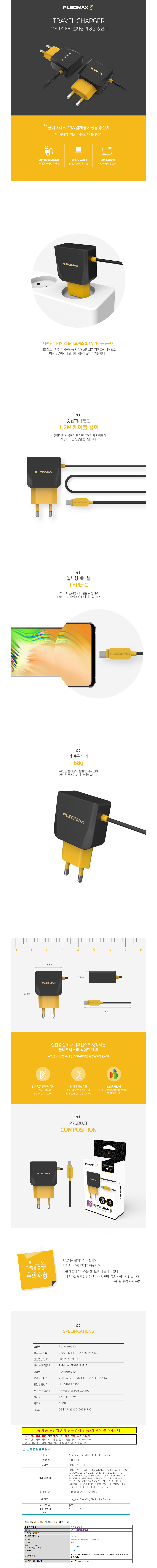 플레오맥스 가정용 일체형 C타입 2.1A 충전기 PLM-P19-210