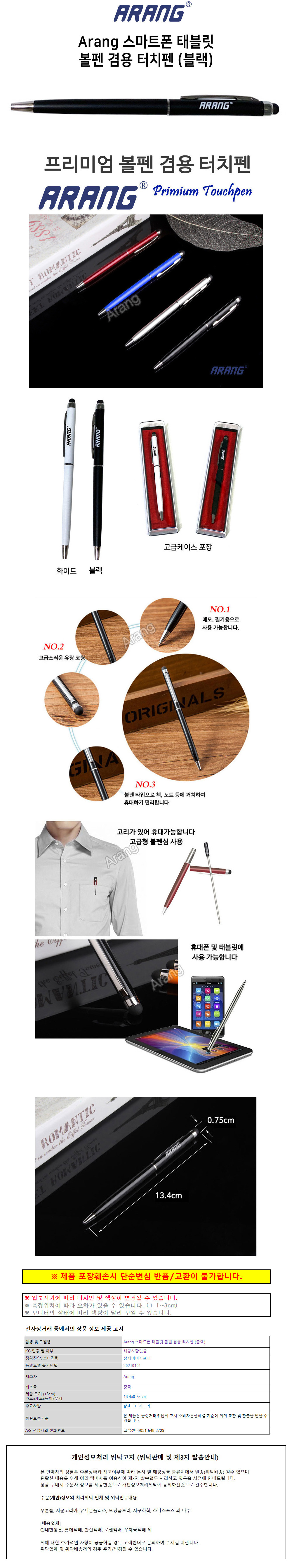 Arang 스마트폰 태블릿 볼펜 겸용 터치펜 블랙