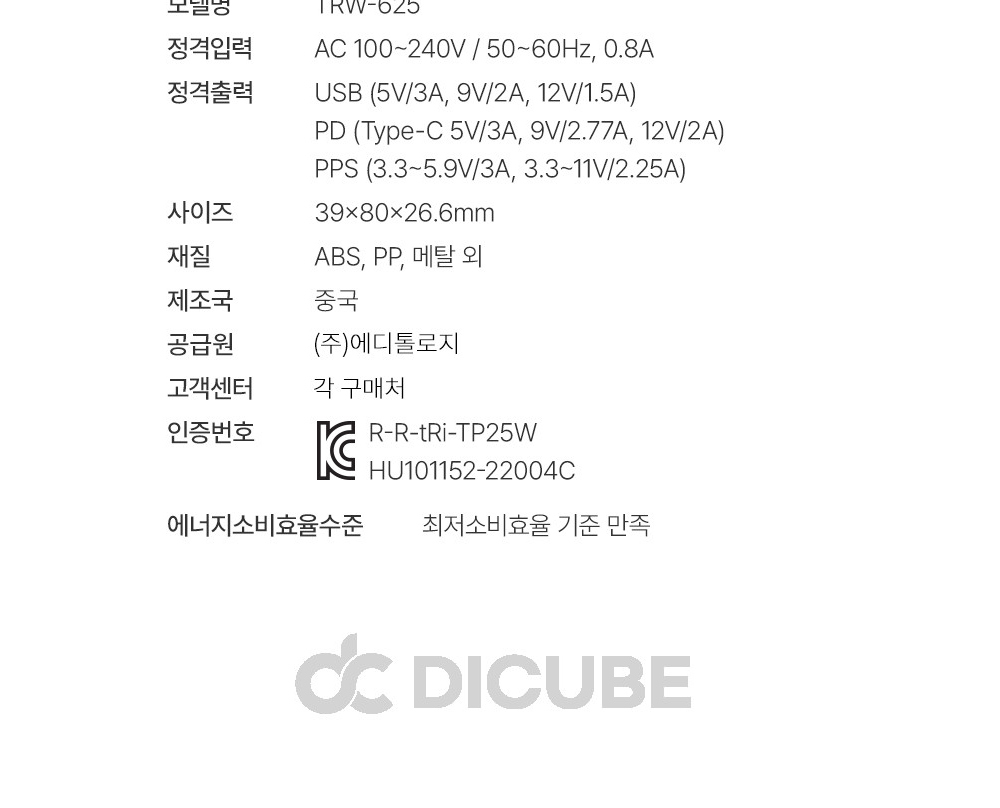 | 품명 및 모델명 | 품명:디큐브 듀얼 충전기 / 모델명:디큐브 듀얼 충전기 |
