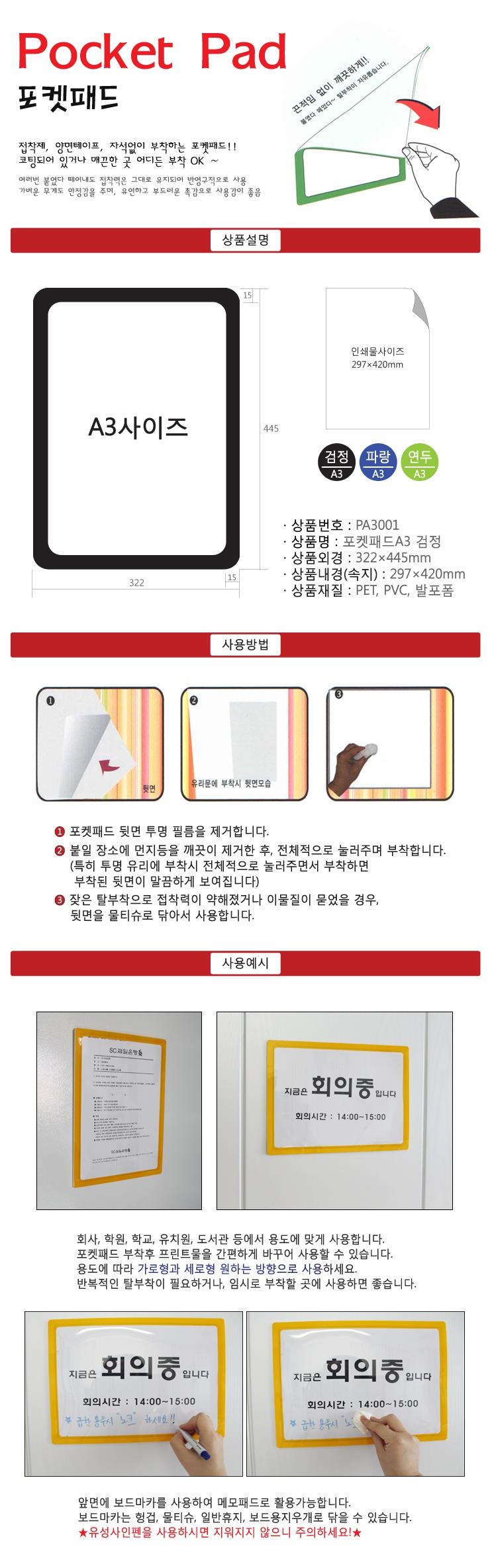 가벼운 탈부착 포켓패드 A3-검정 종이꽂이 냉장고메모