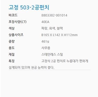 | 품명 및 모델명 | 피스코리아 평화 503 펀치 2공 |