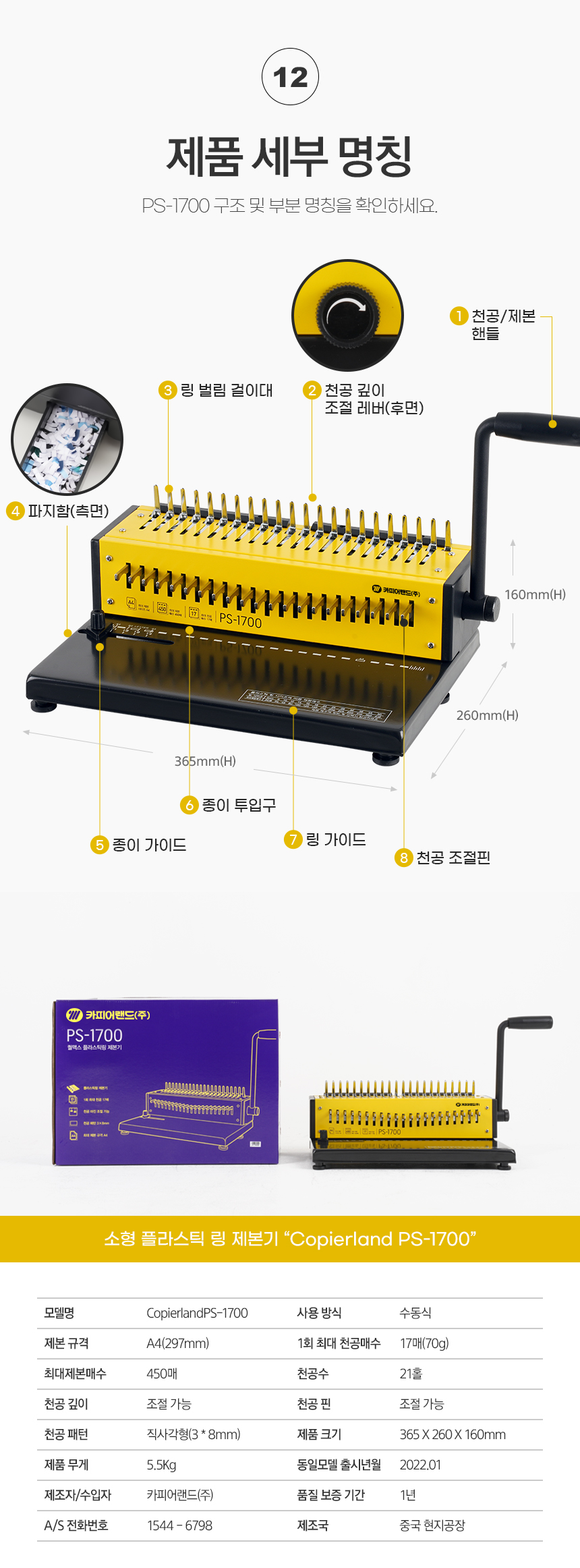 | 품명 및 모델명 | 카피어랜드 플라스틱링 제본기 Qualmax PS-1700 |