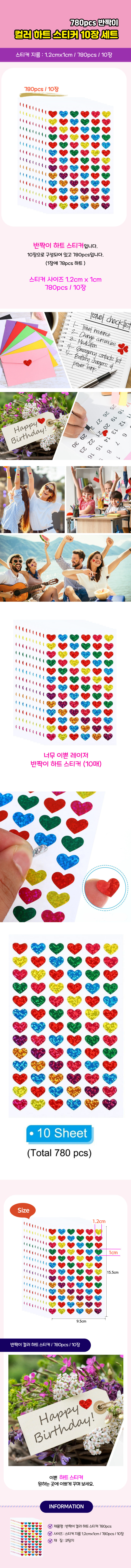 레이저 반짝이 컬러 하트 스티커 780pcs S4106