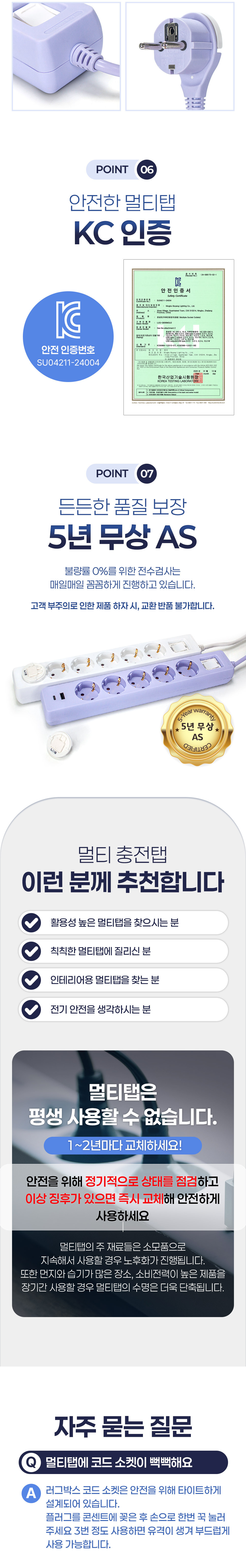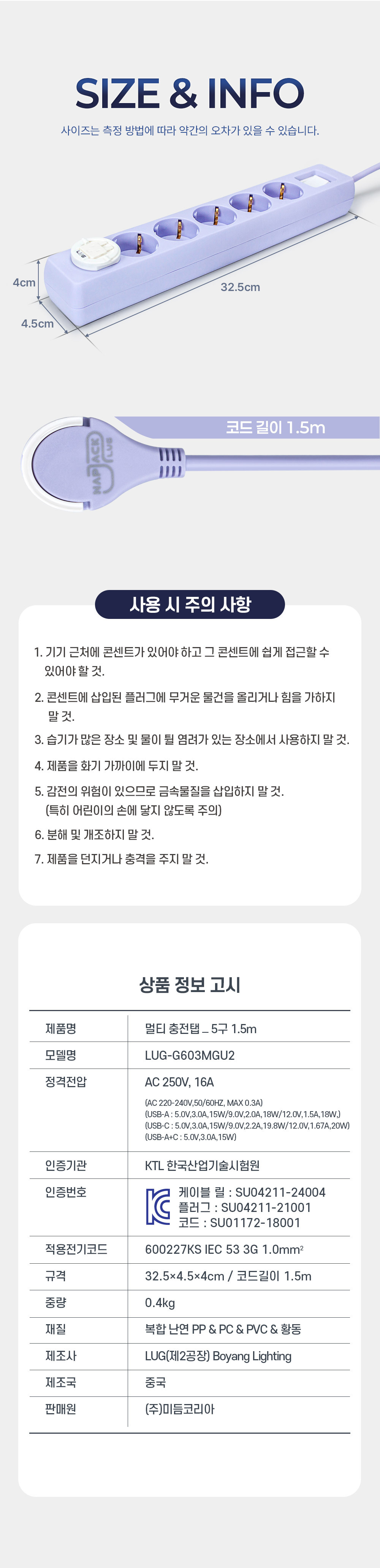 | 품명 및 모델명 | 멀티탭 5구 1.5m USB듀얼 안전차단 절연커버 탑재 |