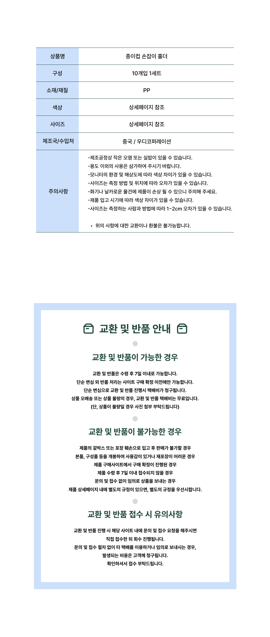 • 단순변심으로 인한 반품 시, 배송 완료 후 7일이 지나면 취소/반품 신청이 접수되지 않습니다.