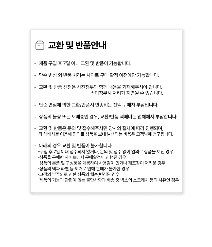 • 단순변심으로 인한 반품 시, 배송 완료 후 7일이 지나면 취소/반품 신청이 접수되지 않습니다.