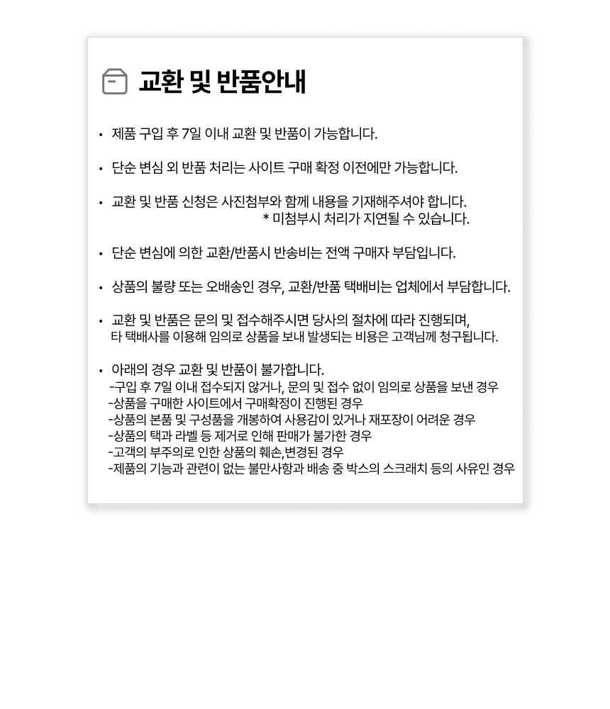 • 단순변심으로 인한 반품 시, 배송 완료 후 7일이 지나면 취소/반품 신청이 접수되지 않습니다.