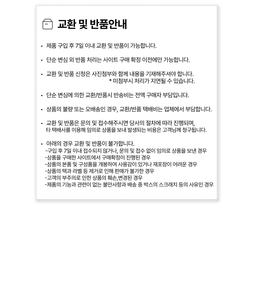 • 단순변심으로 인한 반품 시, 배송 완료 후 7일이 지나면 취소/반품 신청이 접수되지 않습니다.