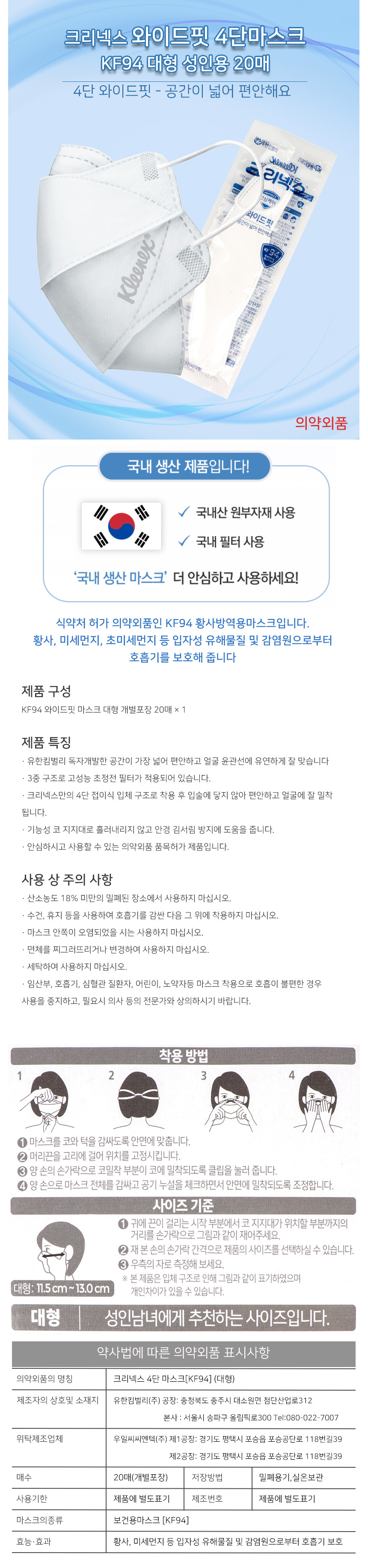 크리넥스 와이드핏 KF94 마스크 대형 화이트 20매