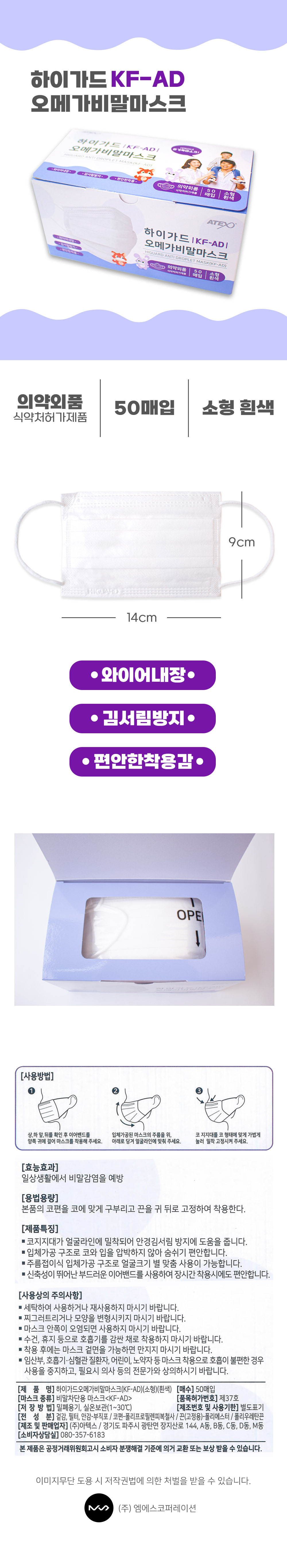 | 품명 및 모델명 | 아텍스 하이가드 KF-AD 오메가비말마스크 소형흰색 50매입 |