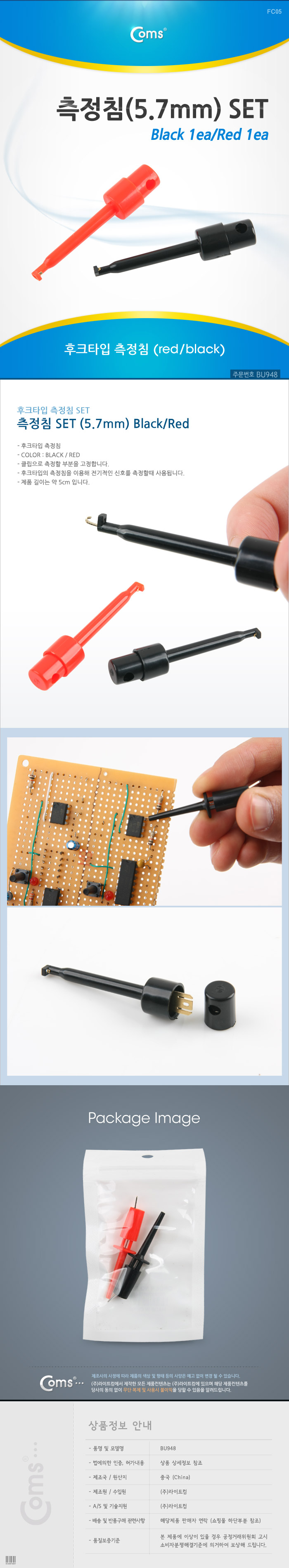 후크 프로브 측정침(5.7mm) 2개입 1세트 Black Red IC 테스트 BU948