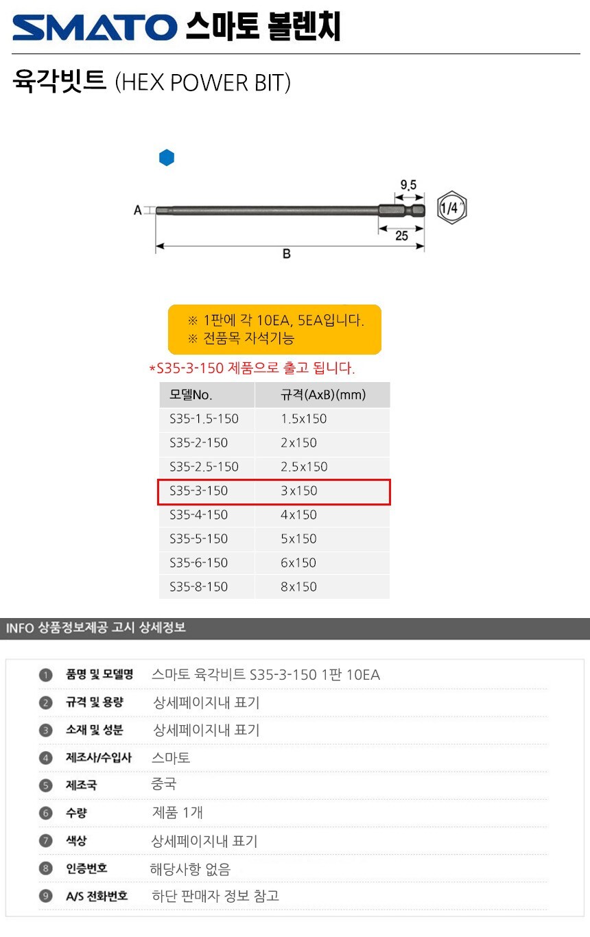 스마토 육각비트 S35-3-150 1판 10EA