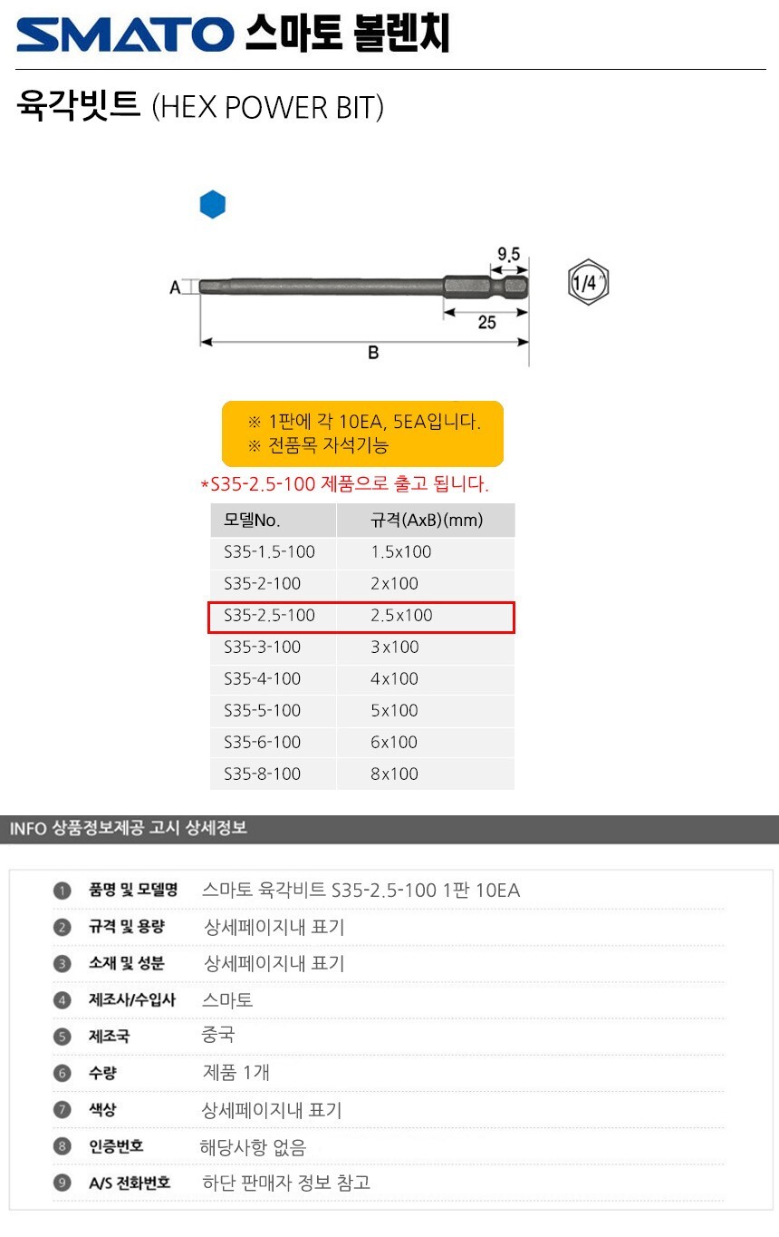 스마토 육각비트 S35-2.5-100 1판 10EA