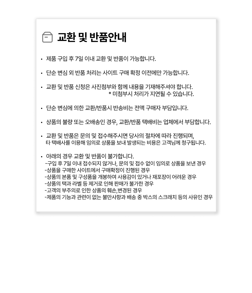 • 단순변심으로 인한 반품 시, 배송 완료 후 7일이 지나면 취소/반품 신청이 접수되지 않습니다.