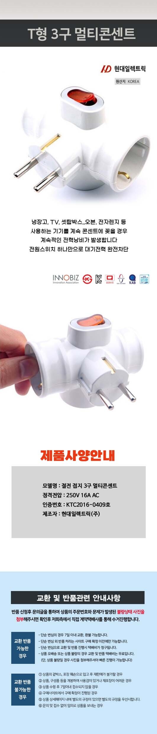 현대 대기전력차단 절전 멀티탭 콘센트 3구 t형