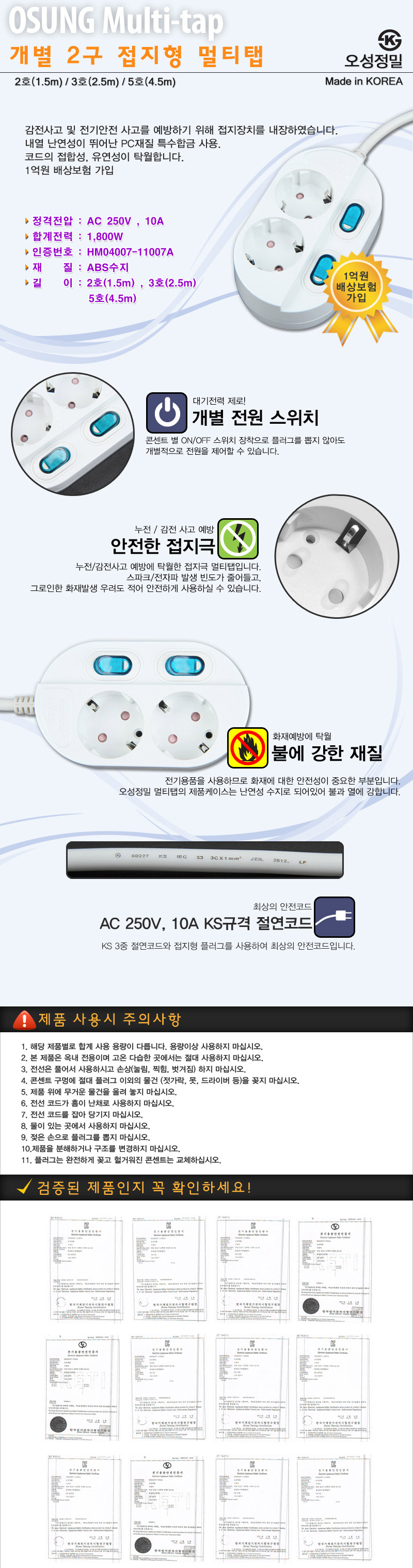 오성정밀 개별형 2구 접지 멀티탭 2.5M L0013633