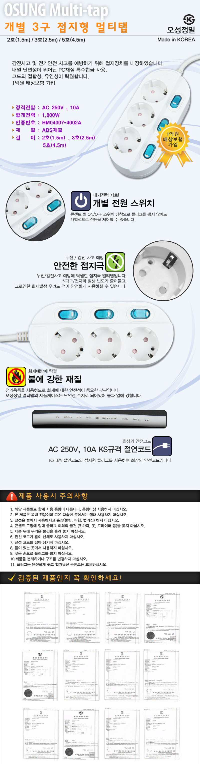오성정밀 개별형 3구 접지 멀티탭 2.5M L0013636