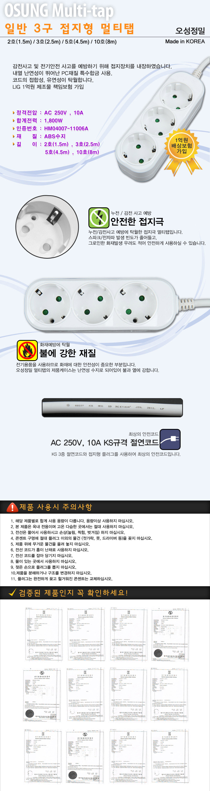 오성정밀 일반형 3구 접지 멀티탭 8M L0013619