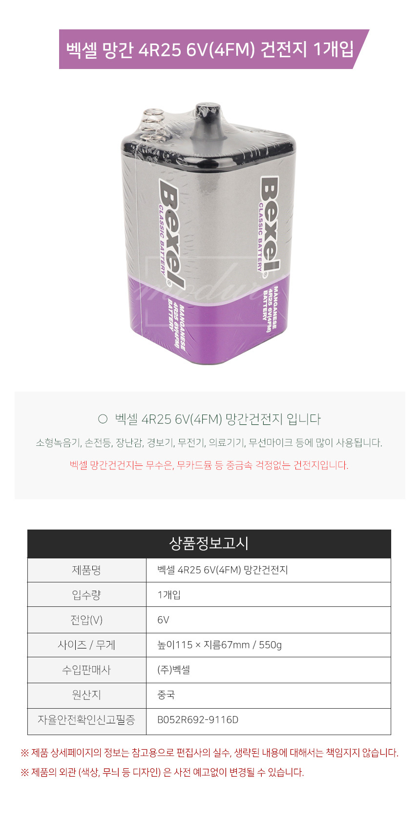 벡셀 망간무수은건전지 4R25(4FM) 6V 1개 랜턴용