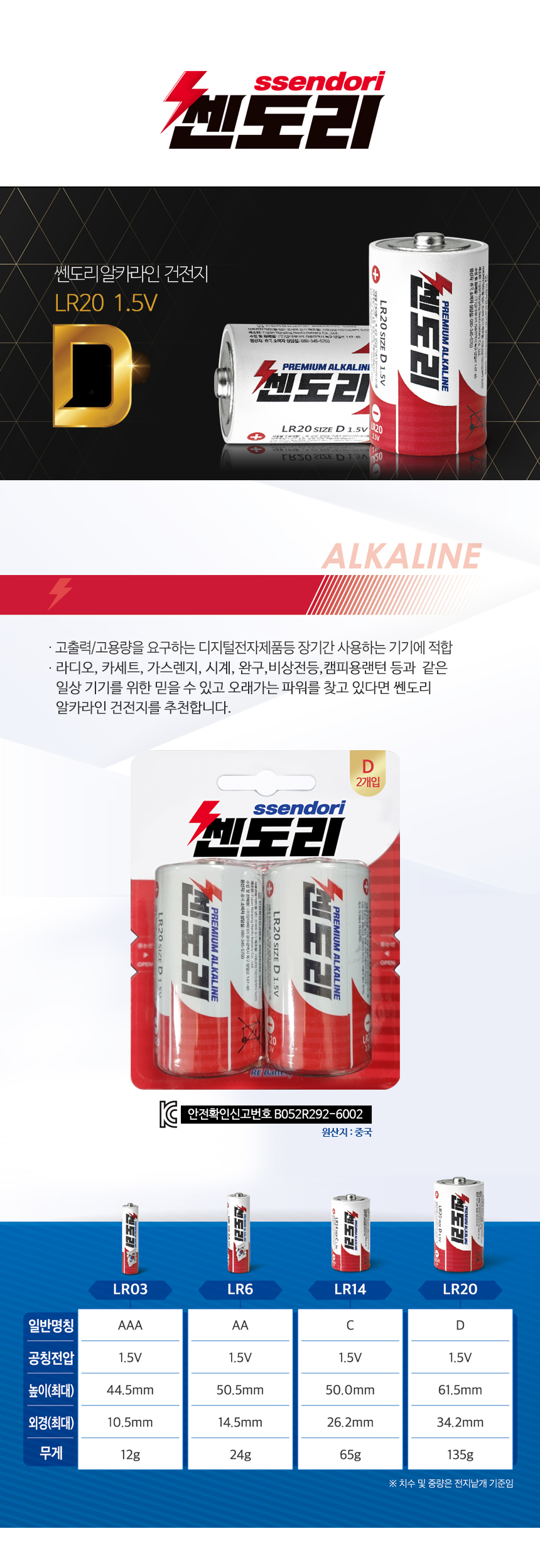 쎈도리 알카라인 건전지 D형 LR20 카드형 1.5V 2알