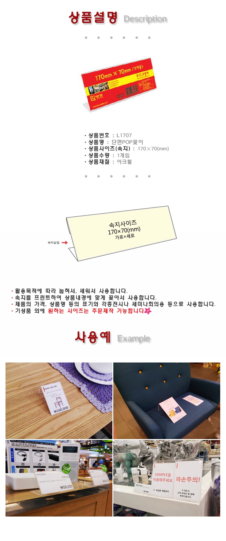 스탠드 단면용 POP꽂이-L1707 카드홀더 테이블안내