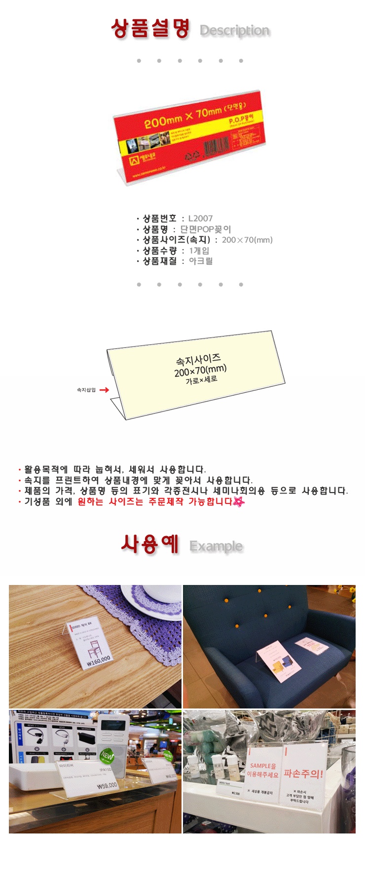 스탠드 단면용 POP꽂이-L2007 매장전시용 POP카드
