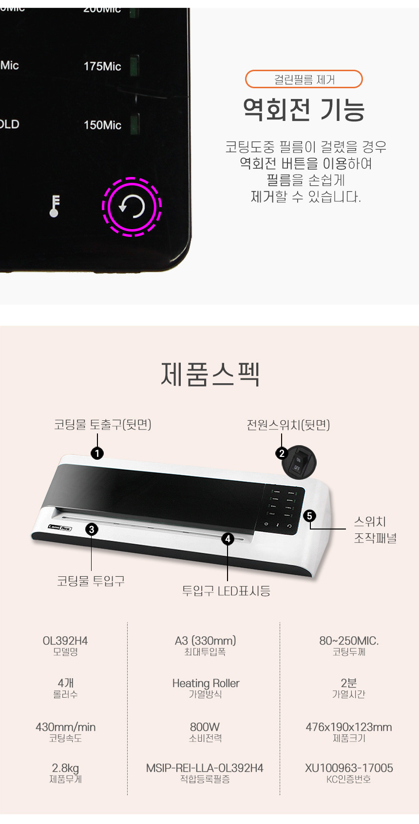 | 품명 및 모델명 | 라미에이스 4롤러 A3 가정/사무용 코팅기 OL392H4 |
