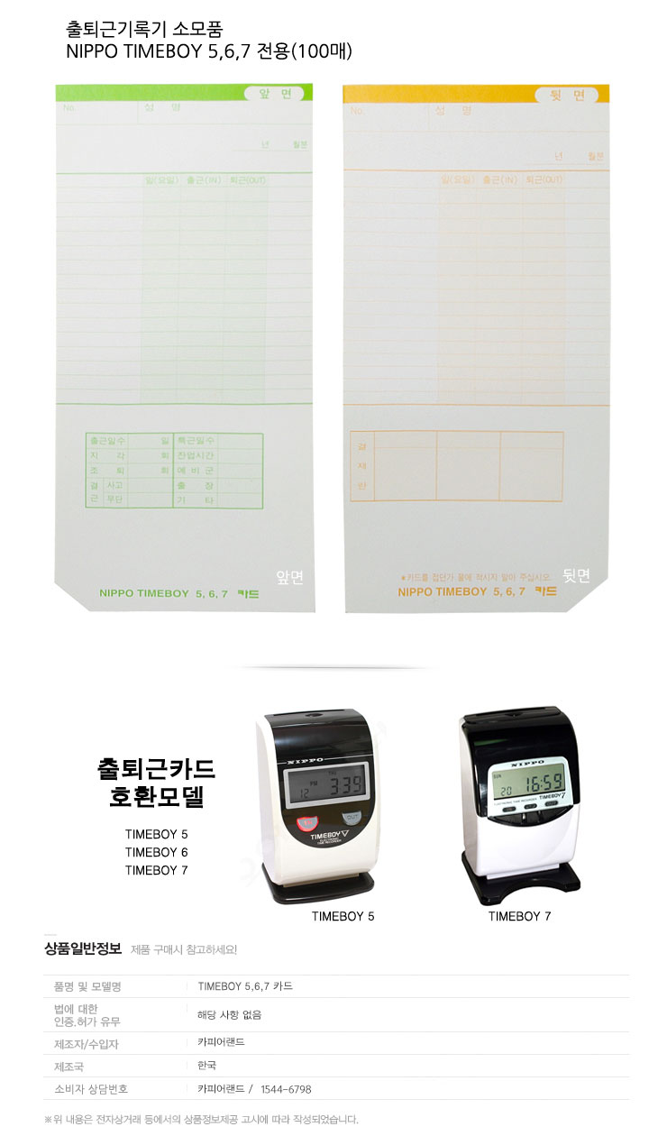| 품명 및 모델명 | 카피어랜드 출퇴근 기록/NIPPO Timeboy 5,6,7 카드 |