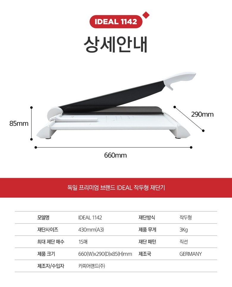 | 품명 및 모델명 | 카피어랜드 A3 직선 작두형재단기/IDEAL 1142 |