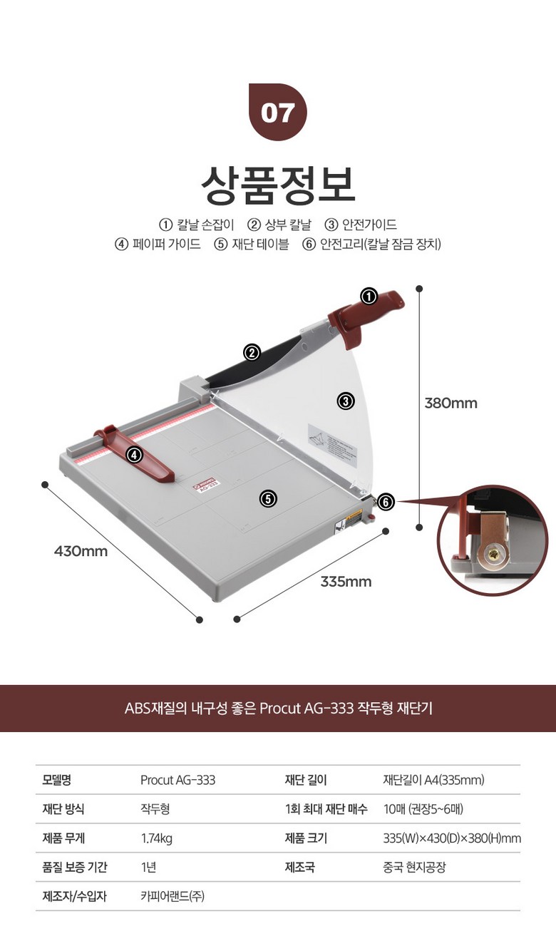 | 품명 및 모델명 | 카피어랜드 A4 작두형재단기/ProCut AG-333 |