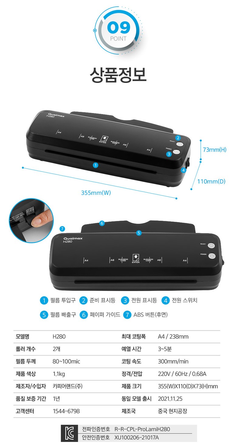 | 품명 및 모델명 | 카피어랜드 A4 코팅기/H280 |