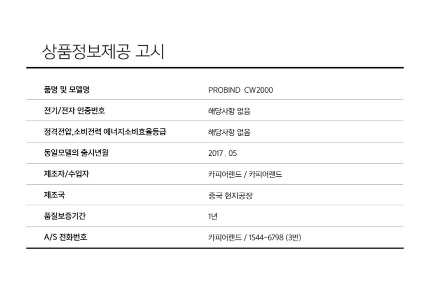 | 품명 및 모델명 | 카피어랜드 3:1 와이어링 제본기/ProBind CW-2000 |